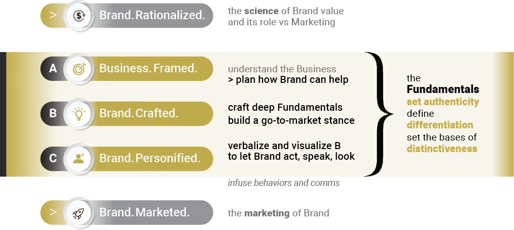 The Brand Fundamentals, charted as A-B-C here, are at the core of the Brand Foundation and their depth, solidity, and meaningfulness …. (I’ll let our clients finish the sentence):